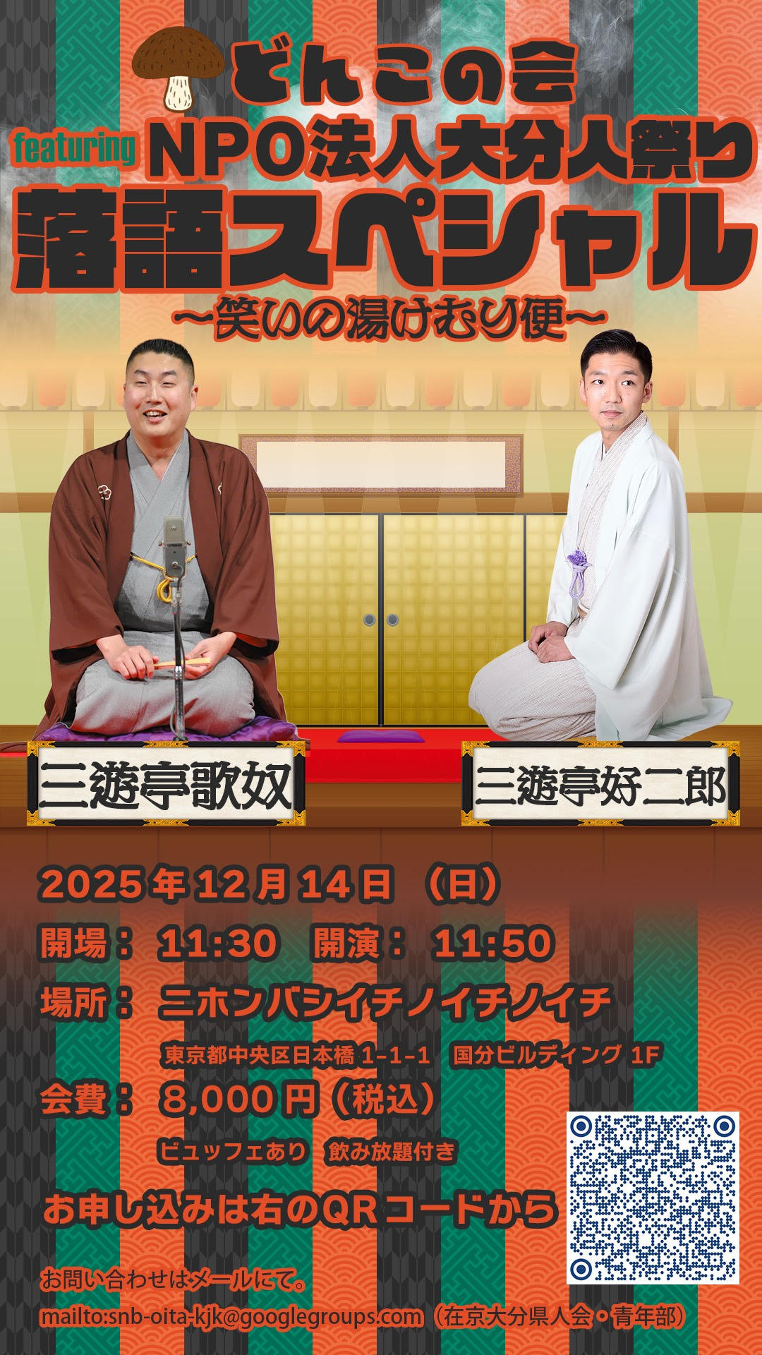 どんこの会 featuring NPO法人大分人祭り『落語スペシャル』 ~笑いの湯けむり便~ 2025年12月14日(日)に、伊藤彩子さん率いるNPO法人大分人祭りとタッグを組んでニホンバシイチノイチノイチで落語会を開催するで。 こちらのイベントは、以下URLからお申し込みください! それでは以下詳細。 お問い合わせ : |