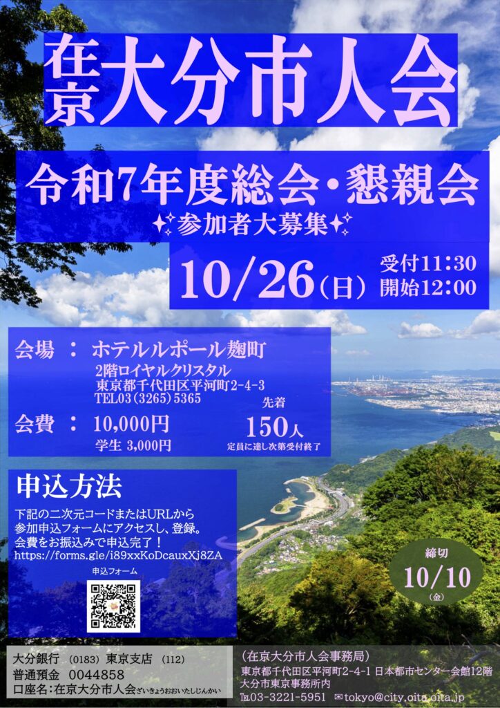 10月26日 (日曜) 12時より、千代田区平河町・ホテルルポール麹町にて、在京大分市人会 令和7年度総会・懇親会を開催します。皆様、こぞってご参加ください。